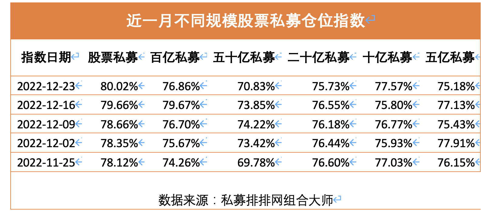 不过,不同规模股票私募仓位现分歧,大私募减仓小私募加仓。伴随着2022年12月19日至2022年12月23日A股遭遇12月来单周最大调整,百亿股票私募仓位指数明显下降。