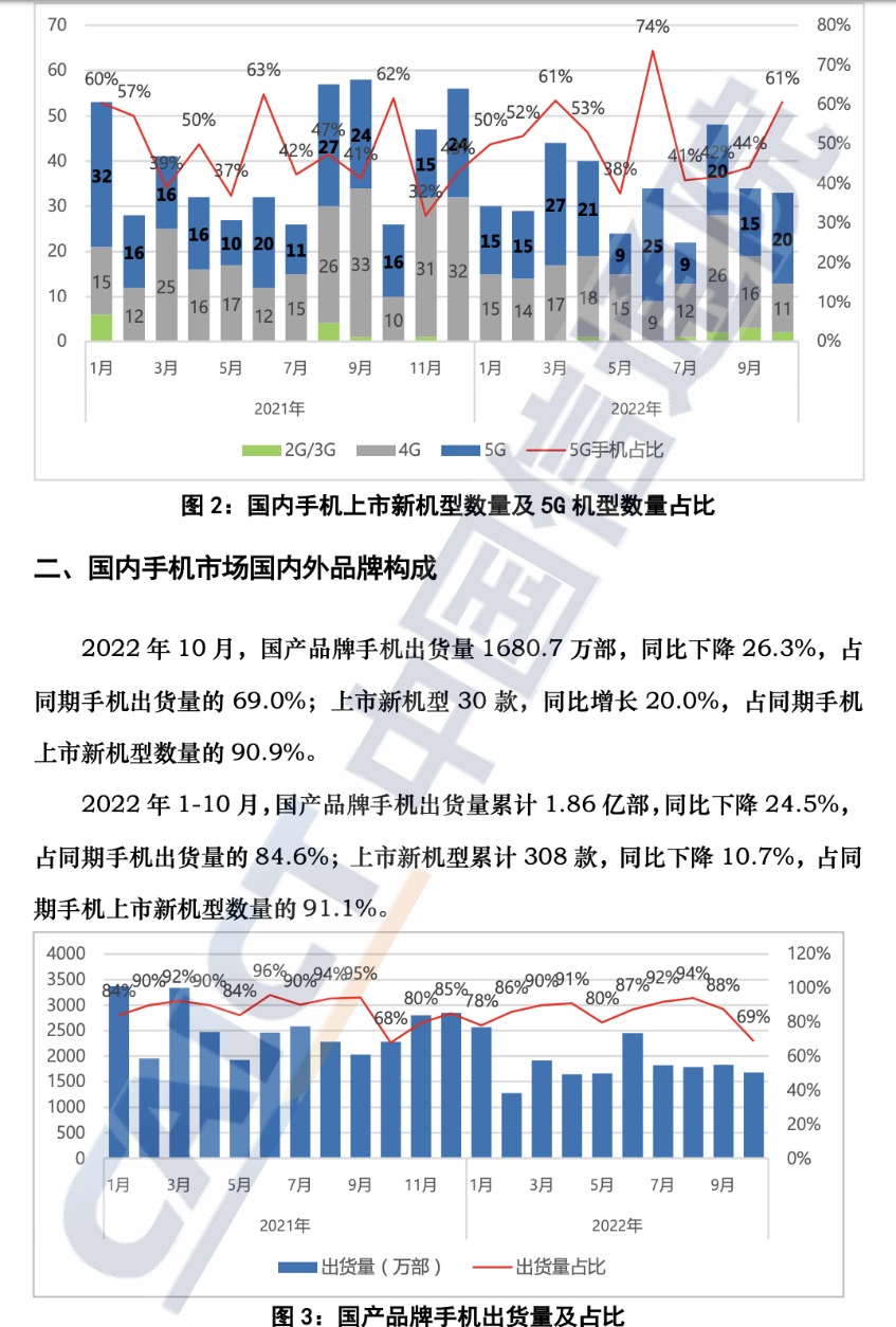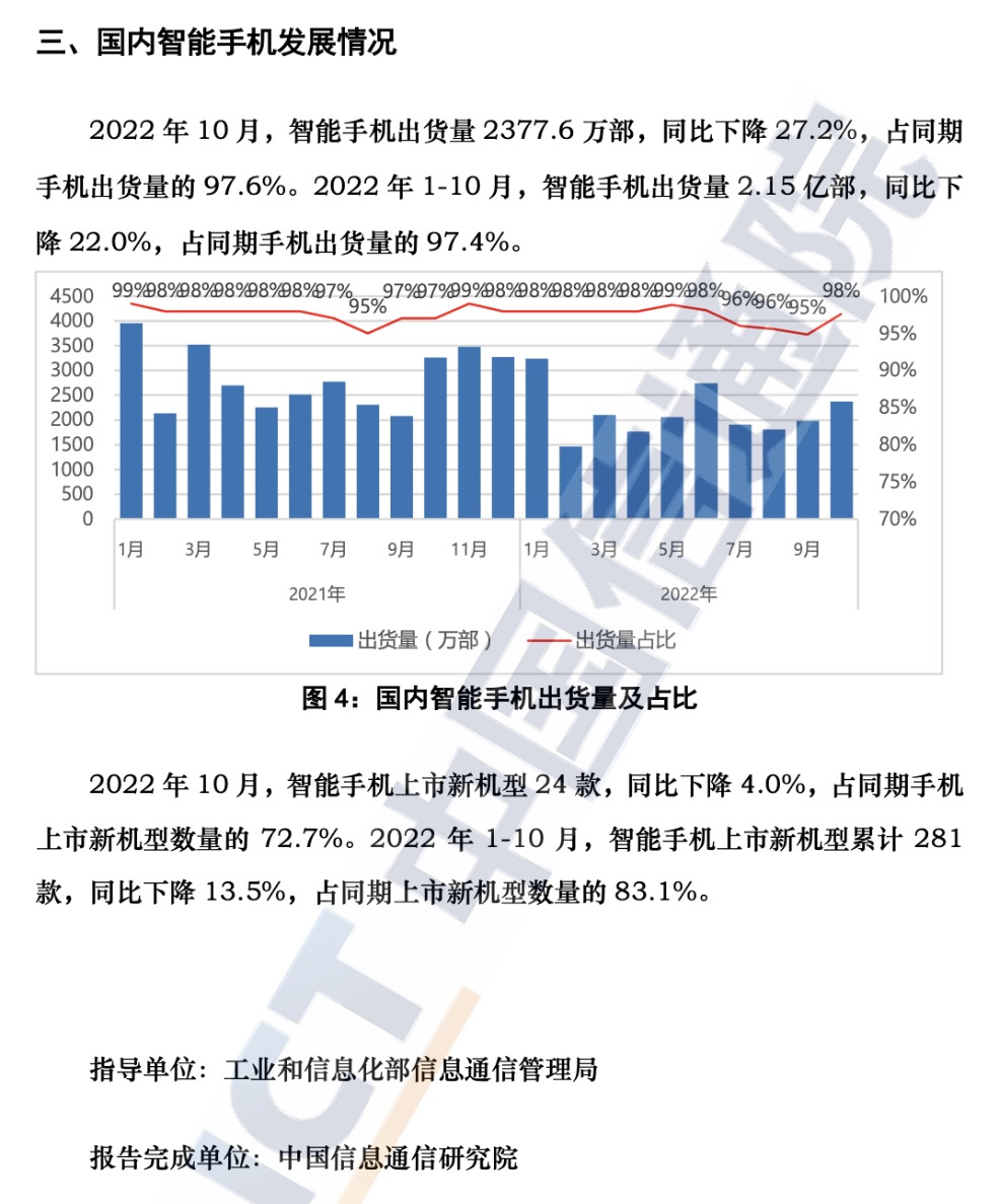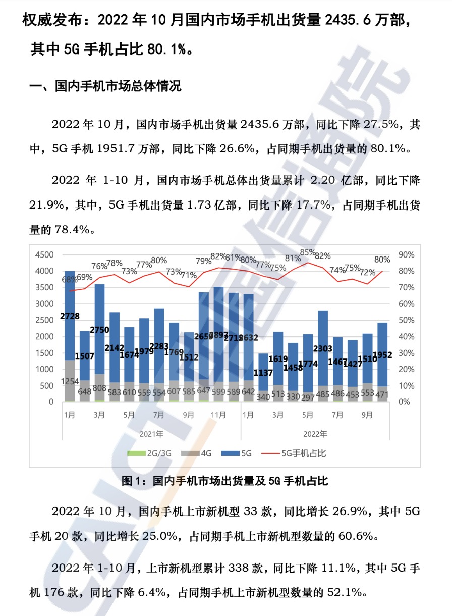 中国信通院12月26日发布2022年10月国内手机市场运行分析报告。2022年10月,国内市场手机出货量2435.6万部,同比下降27.5%,其中,5G手机1951.7万部,同比下降26.6%,占同期手机出货量的80.1%。2022年1-10月,国内市场手机总体出货量累计2.20亿部,同比下降21.9%,其中,5G手机出货量1.73亿部,同比下降17.7%,占同期手机出货量的78.4%。