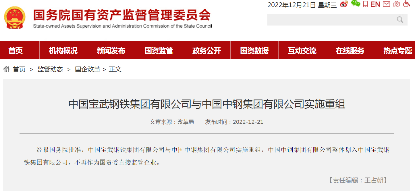 据国资委网站12月21日消息,经报国务院批准,中国宝武钢铁集团有限公司与中国中钢集团有限公司实施重组,中国中钢集团有限公司整体划入中国宝武钢铁集团有限公司,不再作为国资委直接监管企业。