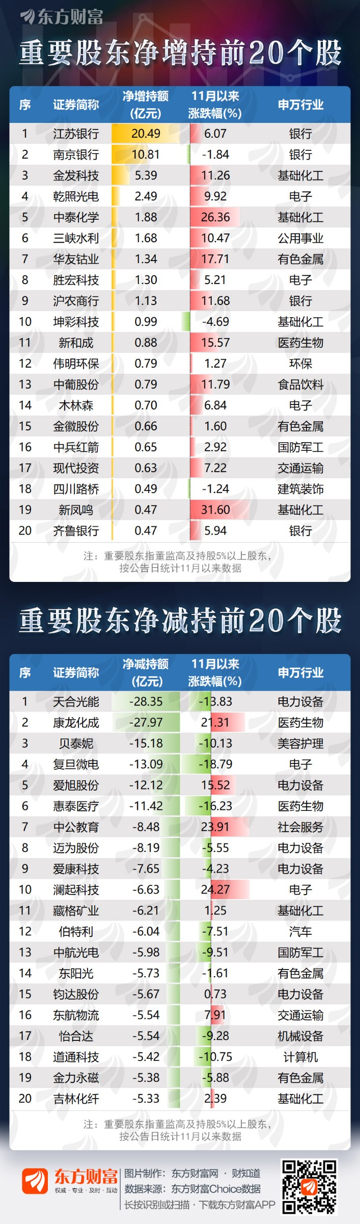 具体看个股,江苏银行重要股东11月以来净增持最多,为20.49亿元。南京银行紧随其后,重要股东净增持10.81亿元。金发科技、乾照光电、中泰化学等个股11月以来也被重要股东净增持居前。