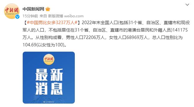 【国家统计局:2022年末中国男性人口比女性人口多3237万人】2022年末全国人口(包括31个省、自治区、直辖市和现役军人的人口,不包括居住在31个省、自治区、直辖市的港澳台居民和外籍人员)141175万人。从性别构成看,男性人口72206万人,女性人口68969万人,总人口性别比为104.69(以女性为100)。