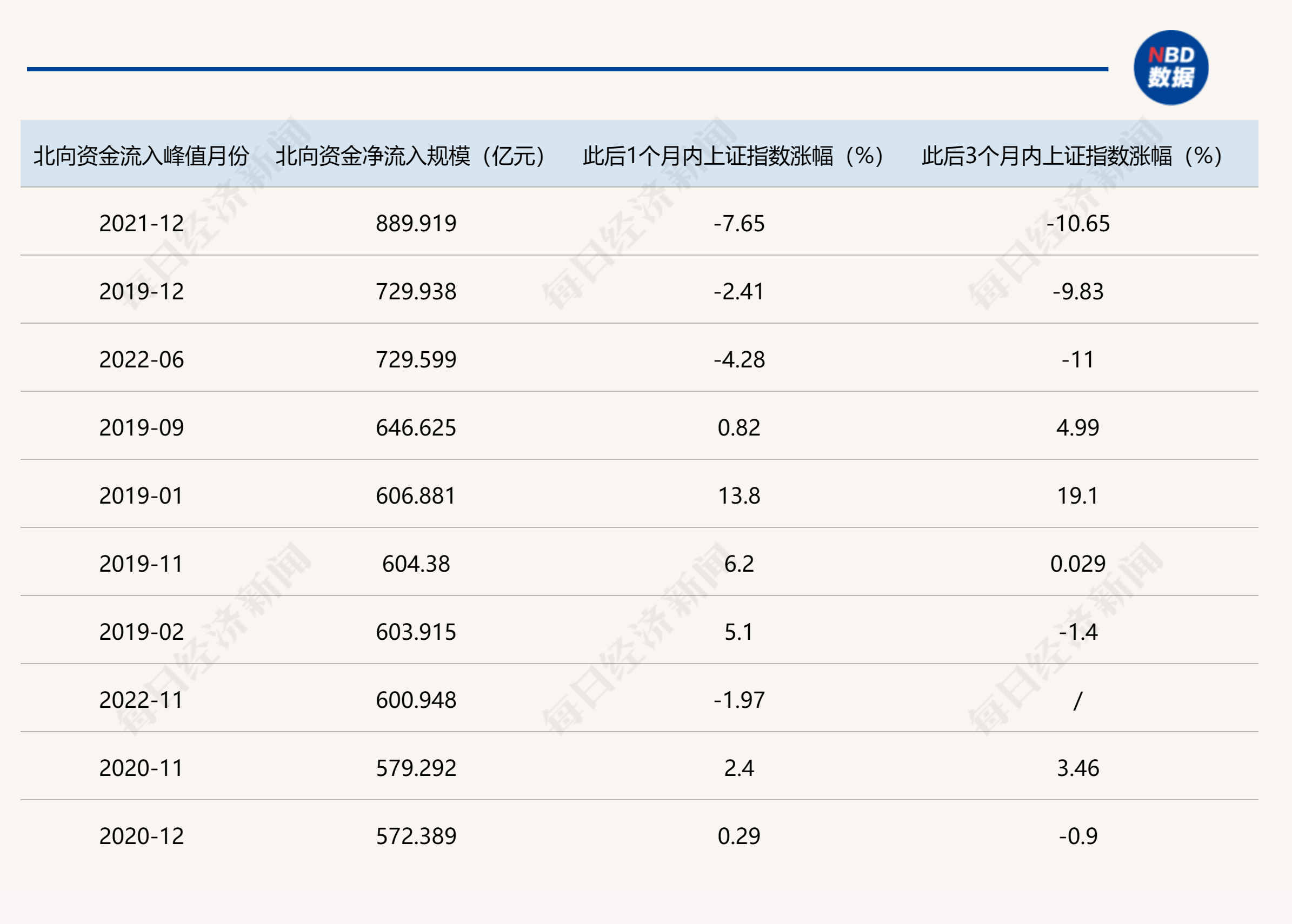 记者统计了除去今年1月之外,历史上北向资金净流入峰值排名前10的月份此后1个月、3个月内上证指数涨幅发现,北向资金在单月大幅净流入后继续高举高打的概率并不太高。