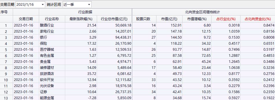 【创纪录!北向资金刚开年就急于抢筹 A股核心资产的“春天”是不是要回来了】截止至今年1月16日的最近一个季度内,北向资金净流入排名居前的行业分别为酿酒、家电、银行、保险、医疗器械、有色等,其中对前四大行业净流入的规模超过了百亿,这些行业恰好都是过去几年来符合外资审美的核心资产。而这与近期A股领涨的行业又有着较高的契合度。