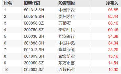 个股方面,据数据,近一个月以来,中国平安、贵州茅台、五粮液、宁德时代等4股获北向资金增持超60亿元。