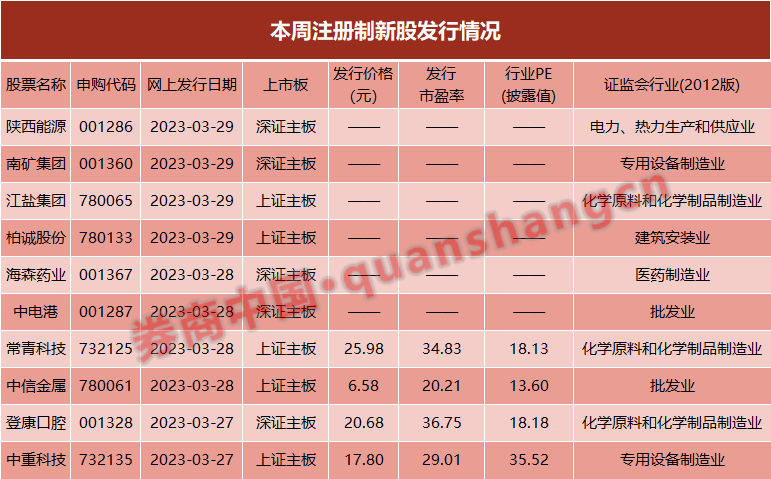 首批10只主板注册制新股,中重科技、登康口腔将在周一(3月27日)申购;中电港、常青科技、中信金属、海森药业将在周二(3月28日)申购;柏诚股份、江盐集团、南矿集团、陕西能源将在周三(3月29日)申购。