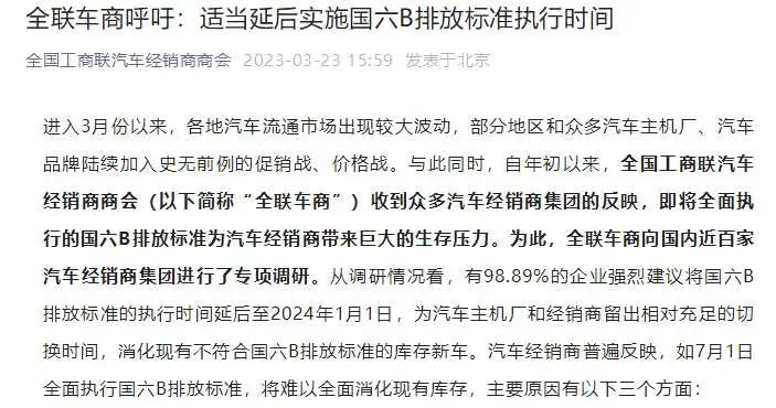 “汽车经销商普遍反映,如7月1日全面执行国六B排放标准,将难以全面消化现有库存。”3月23日,全国工商联汽车经销商商会(以下简称“全联车商”)发文称,汽车经销商生存压力增大,建议将国六B排放标准的执行时间延后至2024年1月1日。
