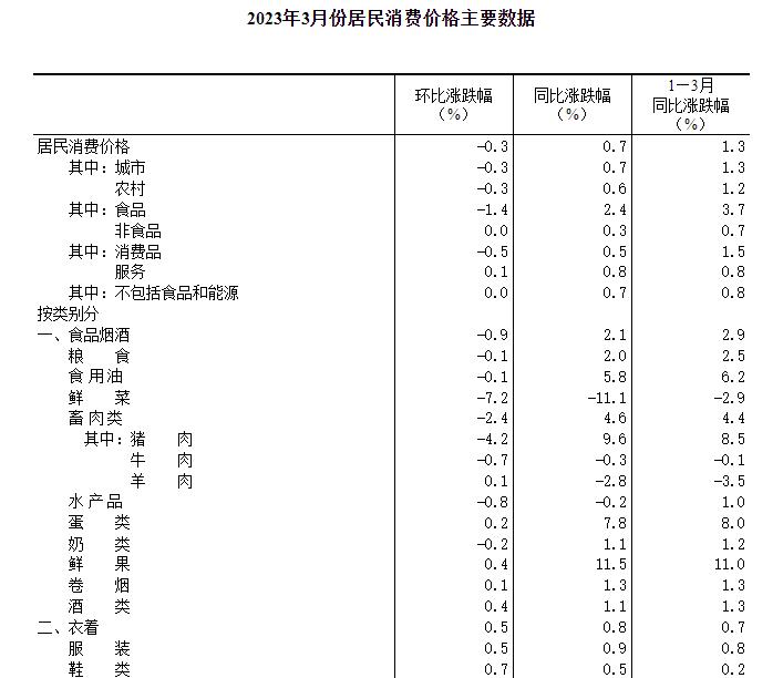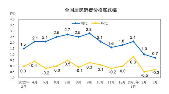 2023年3月份居民消费价格同比上涨0.7% 环比下降0.3%