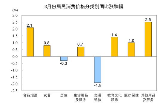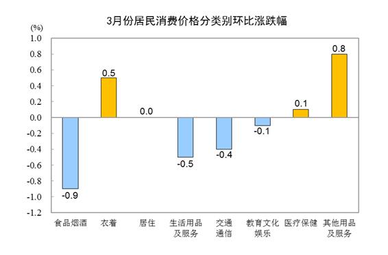 3月份,全国居民消费价格环比下降0.3%。其中,城市下降0.3%,农村下降0.3%;食品价格下降1.4%,非食品价格持平;消费品价格下降0.5%,服务价格上涨0.1%。