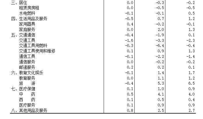 其他七大类价格同比五涨两降。其中,其他用品及服务、教育文化娱乐、医疗保健价格分别上涨2.5%、1.4%和1.0%,衣着、生活用品及服务价格分别上涨0.8%和0.7%;交通通信、居住价格分别下降1.9%和0.3%。