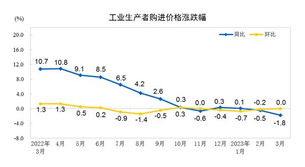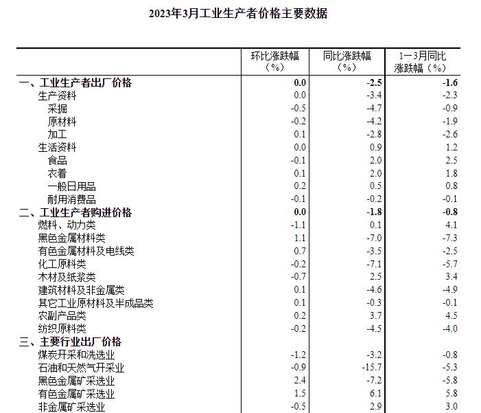 2023年3月份,全国工业生产者出厂价格同比下降2.5%,环比持平;工业生产者购进价格同比下降1.8%,环比持平。一季度,工业生产者出厂价格比去年同期下降1.6%,工业生产者购进价格下降0.8%。