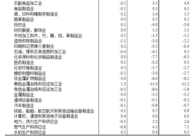 工业生产者购进价格中,化工原料类价格下降7.1%,黑色金属材料类价格下降7.0%,建筑材料及非金属类价格下降4.6%,有色金属材料及电线类价格下降3.5%;农副产品类价格上涨3.7%,燃料动力类价格上涨0.1%。