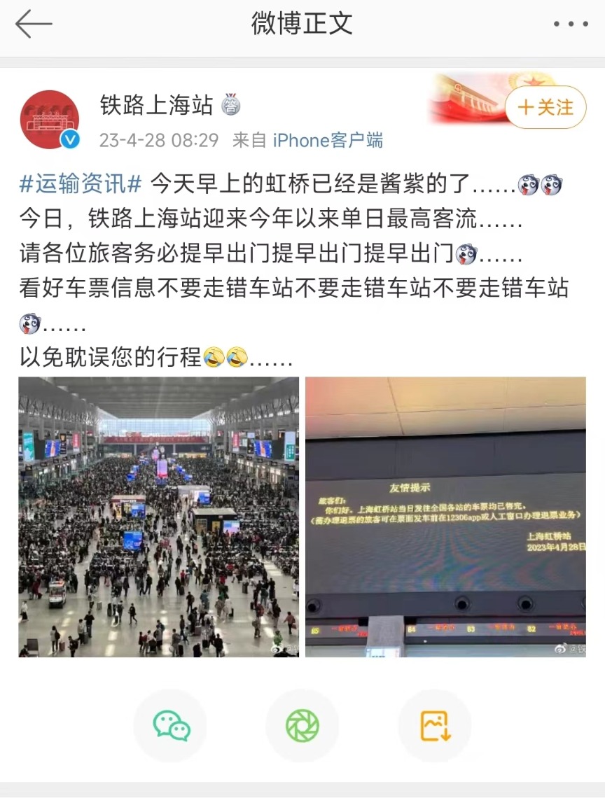 今日一早,铁路上海站的官方微博,发出了一条图文信息,揭示了今年的“五一”小长假,在开启前日已经火爆。