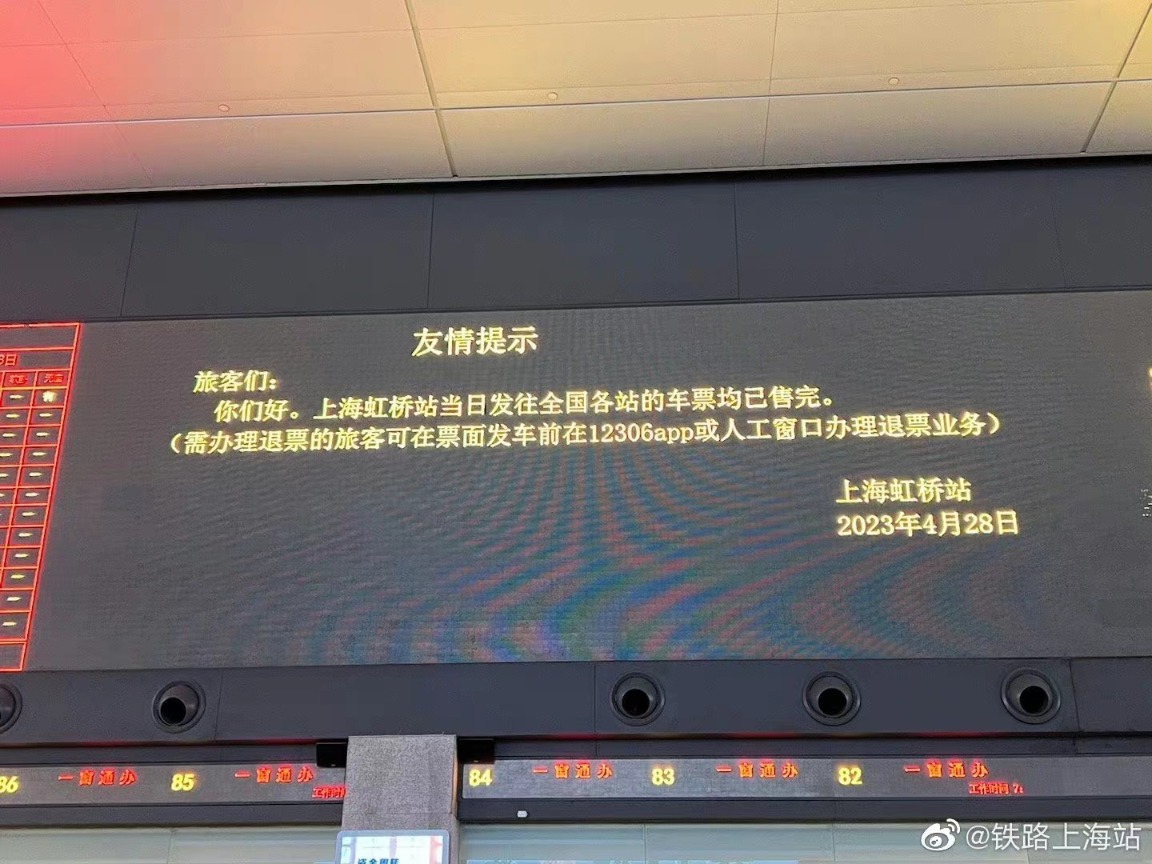今日一早,铁路上海站的官方微博就发布了两张图片,一张是车站里候车大厅已人满为患,另一张则是上海虹桥站的屏幕提示,28日虹桥站发往全国各站的车票均已售完。