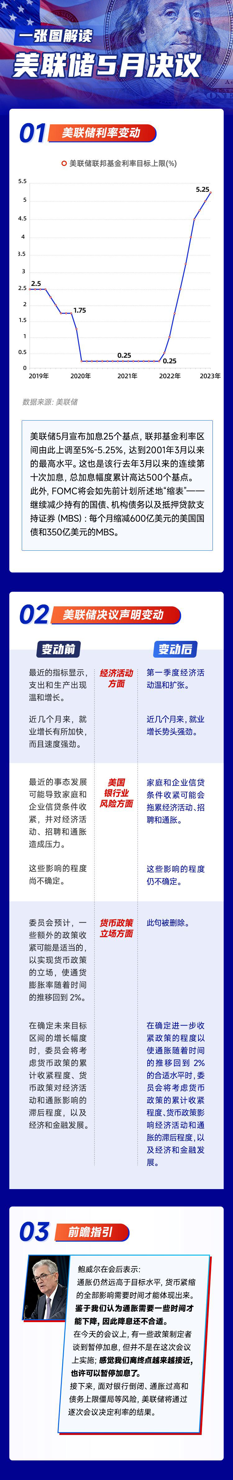 一图解读美联储5月决议:如期加息25基点,未来利率路径仍存悬念。