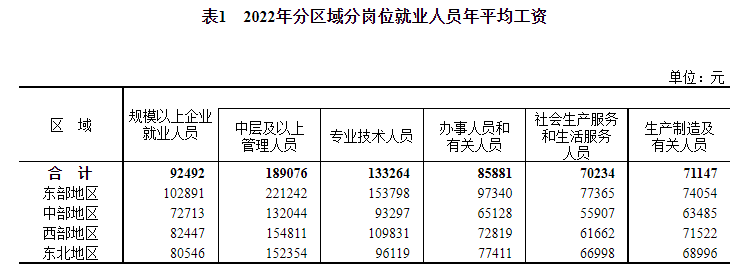 【统计局:2022年全国规模以上企业就业人员年平均工资为92492元 比上年增长5%】其中,中层及以上管理人员189076元,增长4.7%;专业技术人员133264元,增长6.6%;办事人员和有关人员85881元,增长4.1%;社会生产服务和生活服务人员70234元,增长3.3%;生产制造及有关人员71147元,增长3.9%。