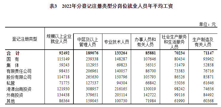 2022年全国规模以上企业就业人员年平均工资为92492元,比上年名义增长5.0%。其中,中层及以上管理人员189076元,增长4.7%;专业技术人员133264元,增长6.6%;办事人员和有关人员85881元,增长4.1%;社会生产服务和生活服务人员70234元,增长3.3%;生产制造及有关人员71147元,增长3.9%。
