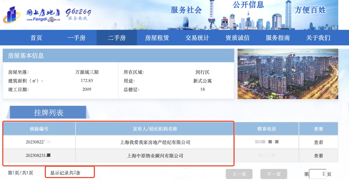举个例子。记者在“网上房地产”查询发现,闵行区万源城三期有一套面积172.83平方米的房源,同时在中原地产和我爱我家挂牌,于是就有两个核验码,在列表里,就会显示有两条挂牌记录。但是注意,两条挂牌记录,不是两套房的意思。