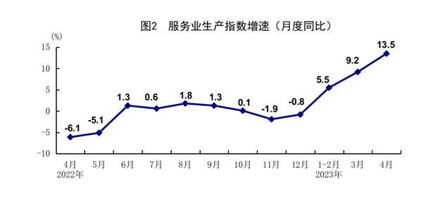 4月份,全国服务业生产指数同比增长13.5%,比上月加快4.3个百分点。分行业看,住宿和餐饮业,批发和零售业,交通运输、仓储和邮政业,信息传输、软件和信息技术服务业生产指数同比分别增长48.7%、18.8%、17.6%、13.2%,比上月分别加快18.8、7.9、5.7、1.2个百分点。1-4月份,全国服务业生产指数同比增长8.4%,比1-3月份加快1.7个百分点。1-3月份,规模以上服务业企业营业收入同比增长5.0%。4月份,服务业商务活动指数为55.1%,业务活动预期指数为62.3%,其中,铁路运输、航空运输、住宿、电信广播电视及卫星传输服务、文化体育娱乐等行业商务活动指数位于60%以上高位景气区间。