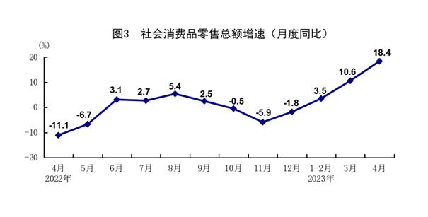 4月份,社会消费品零售总额34910亿元,同比增长18.4%,比上月加快7.8个百分点;环比增长0.49%。按经营单位所在地分,城镇消费品零售额30398亿元,同比增长18.6%;乡村消费品零售额4513亿元,增长17.3%。按消费类型分,商品零售31159亿元,增长15.9%;餐饮收入3751亿元,增长43.8%。升级类商品销售增长较快,限额以上金银珠宝类、体育娱乐用品类、化妆品类商品零售额分别增长44.7%、25.7%、24.3%。1-4月份,社会消费品零售总额149833亿元,同比增长8.5%,比1-3月份加快2.7个百分点。全国网上零售额44108亿元,同比增长12.3%,比1-3月份加快3.7个百分点。其中,实物商品网上零售额37164亿元,增长10.4%,占社会消费品零售总额的比重为24.8%。