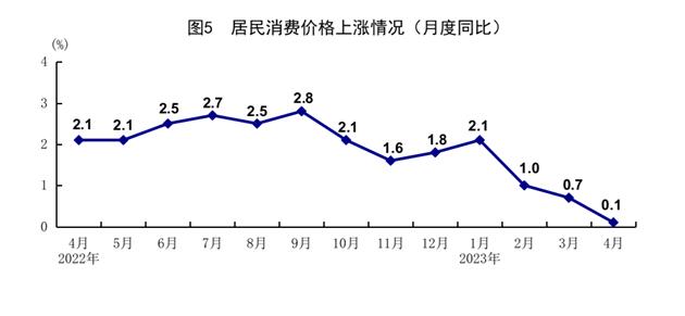 4月份,全国居民消费价格(CPI)同比上涨0.1%,环比下降0.1%。分类别看,食品烟酒价格同比上涨0.8%,衣着价格上涨0.9%,居住价格下降0.2%,生活用品及服务价格上涨0.1%,交通通信价格下降3.3%,教育文化娱乐价格上涨1.9%,医疗保健价格上涨1.0%,其他用品及服务价格上涨3.5%。在食品烟酒价格中,鲜菜价格下降13.5%,粮食价格上涨1.1%,猪肉价格上涨4.0%,鲜果价格上涨5.3%。扣除食品和能源价格后的核心CPI同比上涨0.7%,涨幅与上月相同。1-4月份,全国居民消费价格同比上涨1.0%。