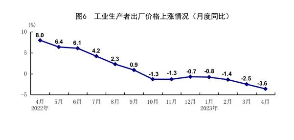 4月份,全国工业生产者出厂价格同比下降3.6%,环比下降0.5%。全国工业生产者购进价格同比下降3.8%,环比下降0.7%。1-4月份,全国工业生产者出厂价格和购进价格同比分别下降2.1%和1.5%。