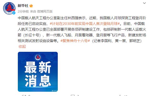 中国载人航天工程办公室副主任林西强表示,近期,我国载人月球探测工程登月阶段任务已启动实施,计划在2030年前实现中国人首次登陆月球。目前,中国载人航天工程办公室已全面部署开展各项研制建设工作,包括研制新一代载人运载火箭(长征十号)、新一代载人飞船、月面着陆器、登月服等飞行产品,新建发射场相关测试发射设施设备等。