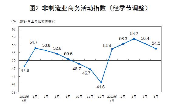 5月份,非制造业商务活动指数为54.5%,比上月下降1.9个百分点,仍高于临界点,非制造业延续恢复性增长。