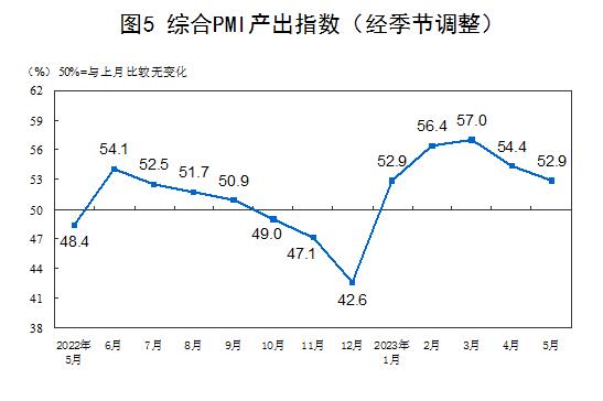 5月份,综合PMI产出指数为52.9%,低于上月1.5个百分点,继续保持在景气区间,表明我国企业生产经营总体延续恢复发展态势。构成综合PMI产出指数的制造业生产指数和非制造业商务活动指数分别为49.6%和54.5%。