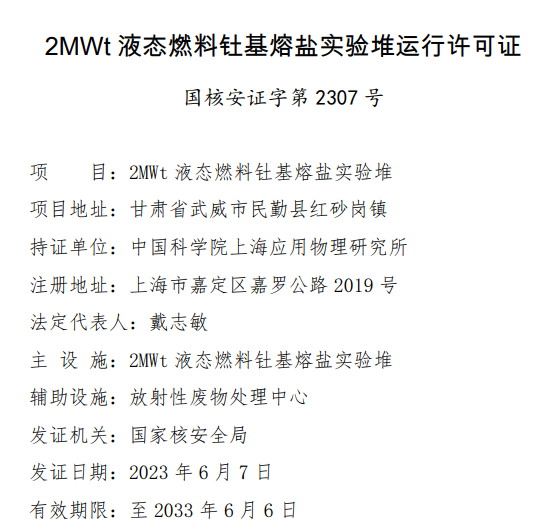 第四代先进核能系统钍基熔盐实验堆项目再取得重大进展。据生态环境部,位于甘肃省武威市的2MWt液态燃料钍基熔盐实验堆近日已获得由国家核安全局颁发的运行许可证。