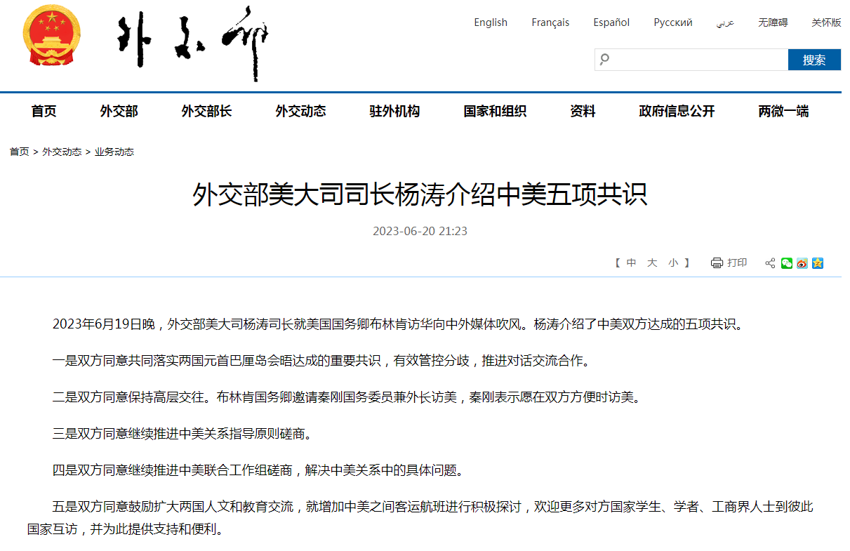 2023年6月19日晚,外交部美大司杨涛司长就美国国务卿布林肯访华向中外媒体吹风。杨涛介绍了中美双方达成的五项共识。