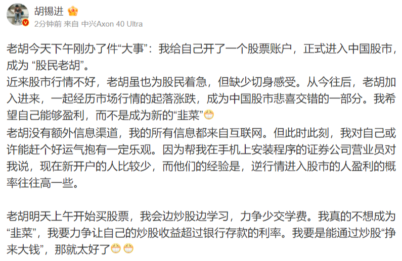 著名媒体人胡锡进:已开一个股票账户 正式进入中国股市