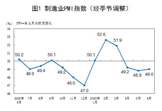 6月份,制造业采购经理指数为49.0%,比上月上升0.2个百分点;非制造业商务活动指数和综合PMI产出指数分别为53.2%和52.3%,比上月下降1.3和0.6个百分点,继续位于扩张区间,我国经济保持恢复发展态势。