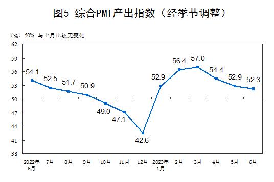 6月份,综合PMI产出指数为52.3%,比上月下降0.6个百分点,继续位于扩张区间,表明我国企业生产经营总体延续扩张态势。