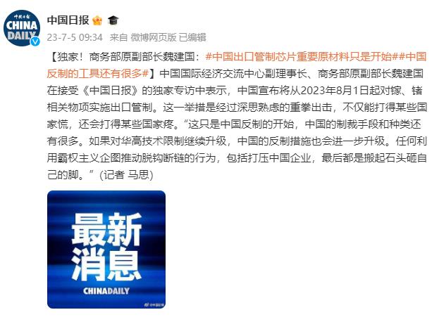 【商务部原副部长魏建国:中国出口管制芯片重要原材料只是开始 反制的工具还有很多】中国国际经济交流中心副理事长、商务部原副部长魏建国在接受《中国日报》的独家专访中表示,中国宣布将从2023年8月1日起对镓、锗相关物项实施出口管制。这一举措是经过深思熟虑的重拳出击,不仅能打得某些国家慌,还会打得某些国家疼。“这只是中国反制的开始,中国的制裁手段和种类还有很多。如果对华高技术限制继续升级,中国的反制措施也会进一步升级。