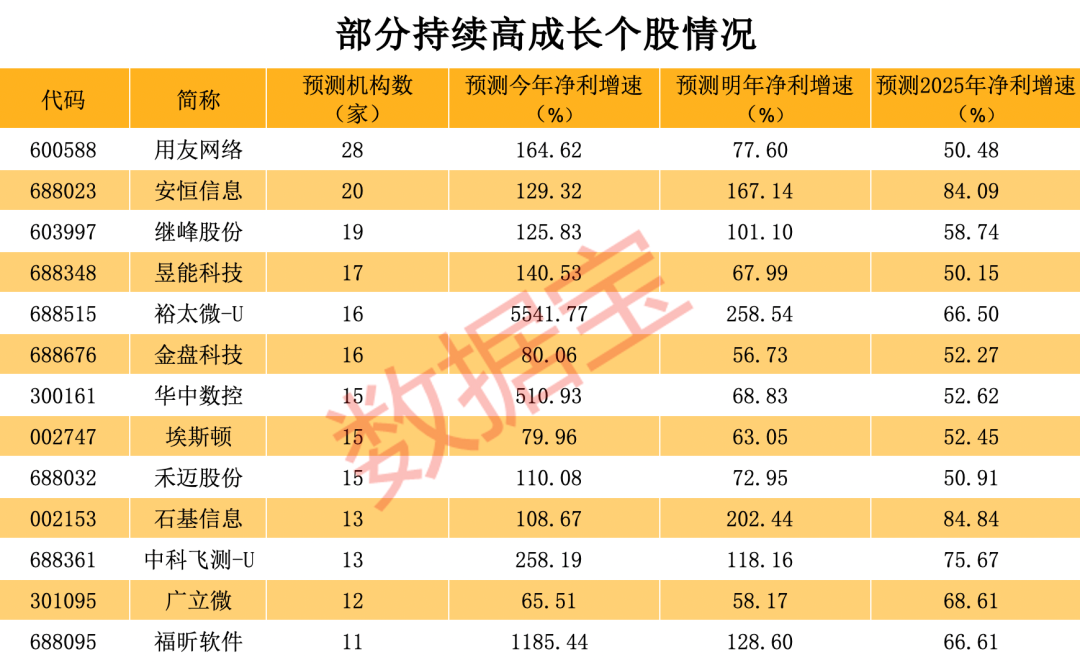 未来成长性更为投资者所关注。数据显示,根据10家以上机构一致预测,有13家民企今年、明年及2025年净利增速均超50%。其中,石基信息和安恒信息近三年净利润增速均超80%,中科飞测-U、福昕软件、裕太微-U三年净利增速均超60%。