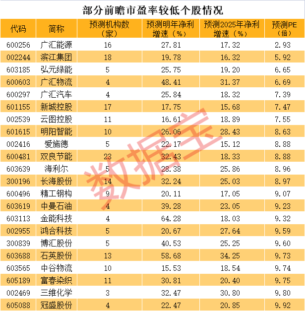 从预测市盈率角度看,广汇能源最低,不足3倍。此外,滨江集团、弘元绿能、广汇物流等个股预测市盈率均不足7倍。