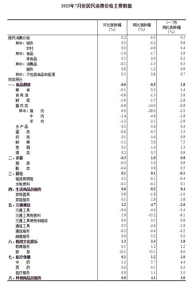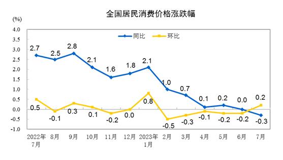 2023年7月份居民消费价格同比下降0.3% 环比上涨0.2%