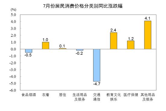 据测算,在7月份0.3%的CPI同比降幅中,上年价格变动的翘尾影响约为0,上月为0.5个百分点;今年价格变动的新影响约为-0.3个百分点,上月为-0.5个百分点。