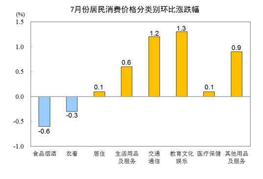 7月份,全国居民消费价格环比上涨0.2%。其中,城市上涨0.3%,农村持平;食品价格下降1.0%,非食品价格上涨0.5%;消费品价格下降0.1%,服务价格上涨0.8%。
