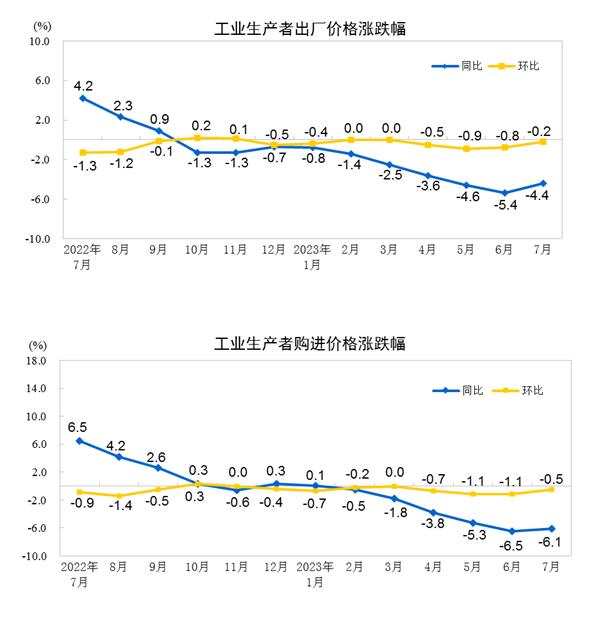 2023年7月份,全国工业生产者出厂价格同比下降4.4%,环比下降0.2%;工业生产者购进价格同比下降6.1%,环比下降0.5%。1—7月平均,工业生产者出厂价格比上年同期下降3.2%,工业生产者购进价格下降3.5%。
