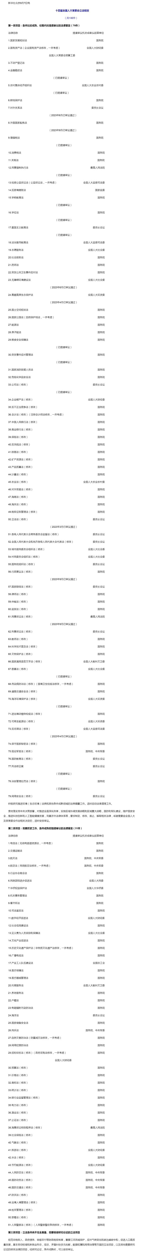 新华社受权发布十四届全国人大常委会立法规划。其中,条件比较成熟、任期内拟提请审议的法律草案(79件),包括金融稳定法(已提请审议)、反不正当竞争法(修改)、网络安全法(修改)等,对推进全面深化改革,实施区域协调发展战略和区域重大战略,国防和军队建设,维护国家安全,推进科技创新和人工智能健康发展,完善涉外法律体系等,要求制定、修改、废止、解释相关法律,或者需要由全国人大及其常委会作出相关决定的,适时安排审议。