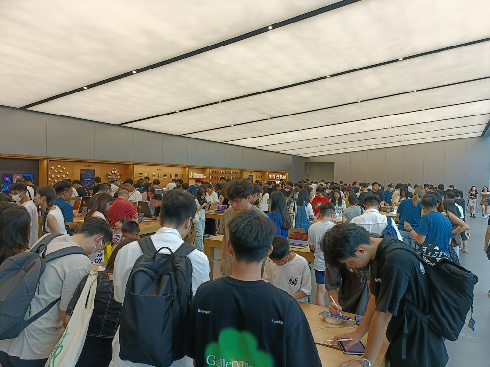 眼下,苹果新机发售在即,记者走访的广深地区多家线下店仍难看出“迎新”氛围。在广州天环广场苹果官方直营店,趁着周末前来进行产品体验、咨询新机消息、打算旧机换购的人不在少数,但顾客观望意浓。