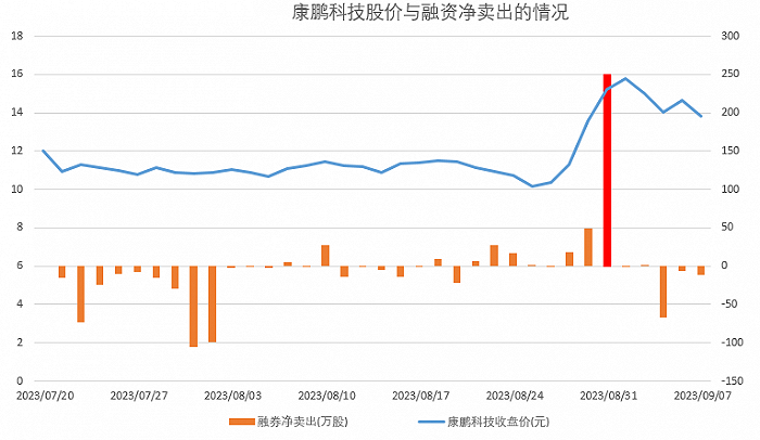 结合康鹏科技的融券余额来看,Wind数据显示,自8月2日起一直到8月30日以前该股的融券余额在1000万元以下,8月30日突增到1772.83万元,8月31日进一步爆增至5783万元,9月1日更是达到了5980万元,而其融券余额首次超过5000万的连续两个交易日正是康鹏科技炸板的两天。值得注意的是,康鹏科技8月30号日融券净卖出249.9万股。