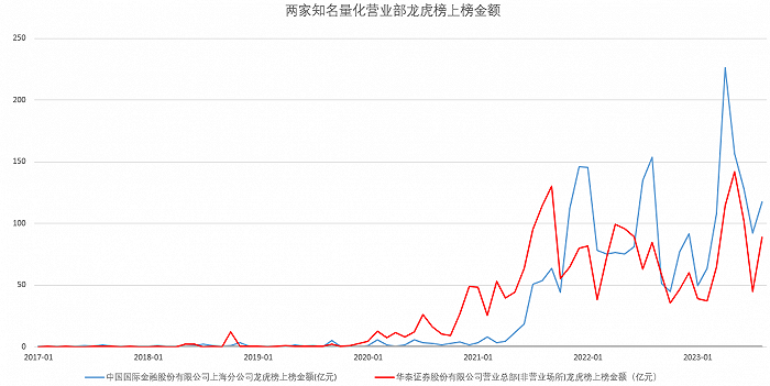 界面新闻统计了国内两个知名的量化席位龙虎榜上榜情况,分别是中国国际金融股份有限公司上海分公司和华泰证券股份有限公司营业总部(非营业场所)。