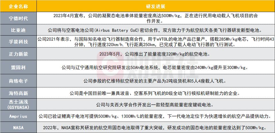 宁德时代2023年4月宣布,公司的凝聚态电池单体能量密度高达500Wh/kg,正在进行民用电动载人飞机项目的合作开发。