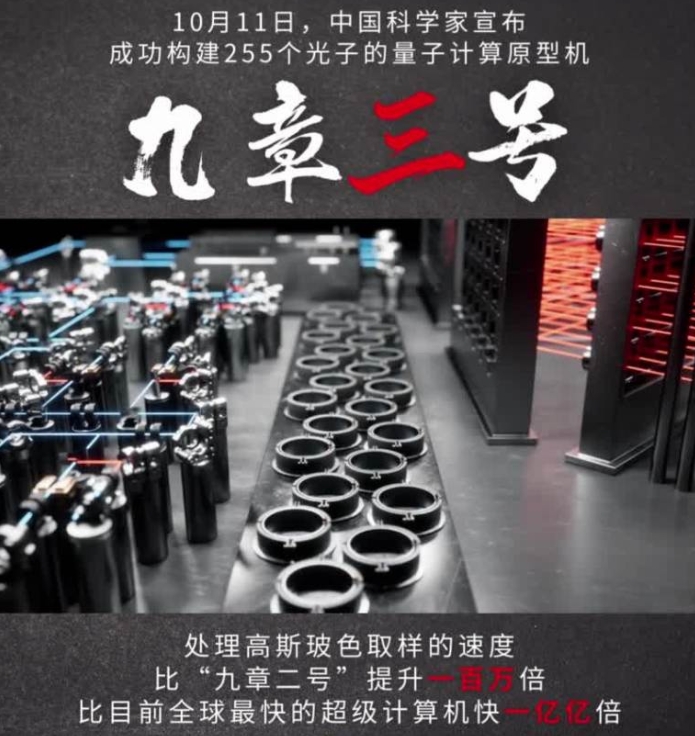10月11日,中国科学技术大学潘建伟、陆朝阳等组成的研究团队与中国科学院上海微系统与信息技术研究所、国家并行计算机工程技术研究中心合作,宣布成功构建255个光子的量子计算原型机“九章三号”。这项成果再度刷新光量子信息技术世界纪录,求解高斯玻色取样数学问题比目前全球最快的超级计算机快一亿亿倍,在研制量子计算机之路上迈出重要一步。