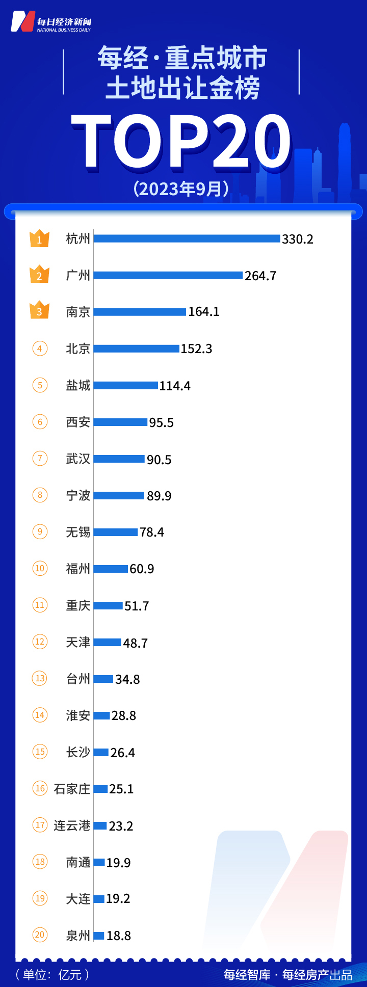 9月份,杭州以高达330.2亿元的土地出让金领跑20城,其次是广州、南京、北京和盐城,分别揽下264.7亿元、164.1亿元、152.3亿元和114.4亿元土地出让金。
