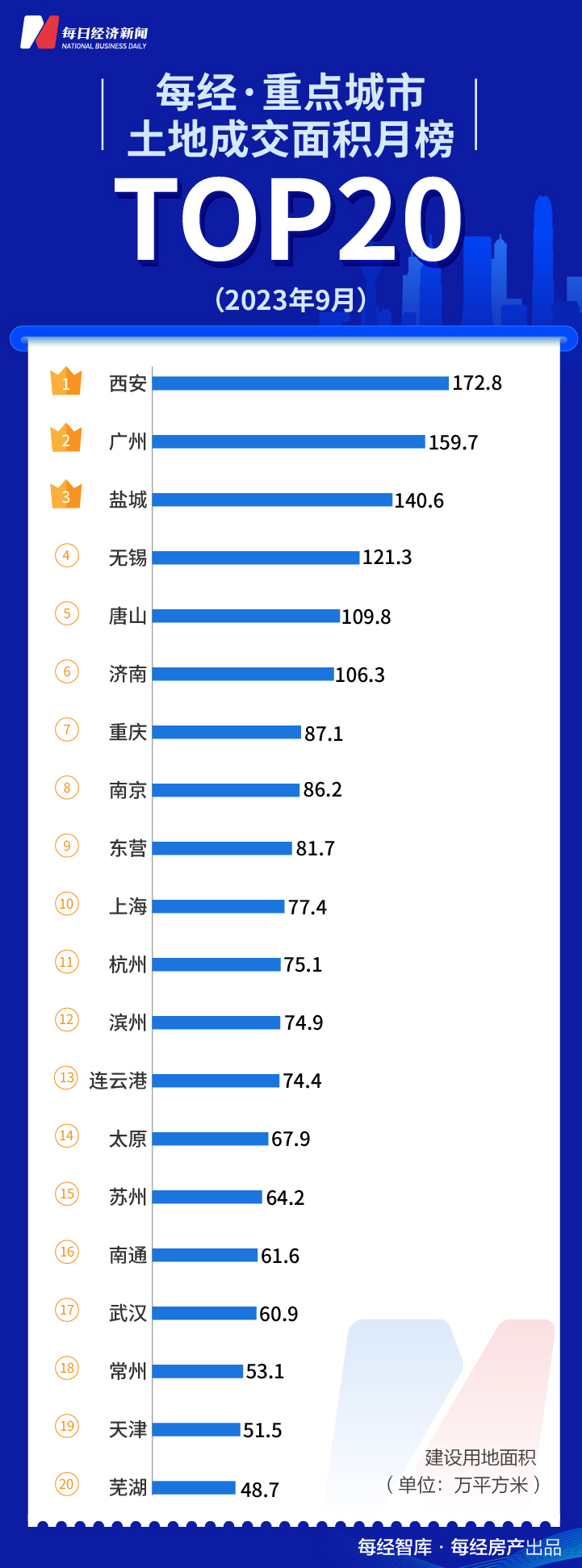 从土地成交面积榜来看,9月份,TOP20城成交建设用地合计1775.2万平方米,环比减少50万平方米。西安、广州、盐城成交面积前三,此外无锡、唐山、济南成交面积超100万平方米。