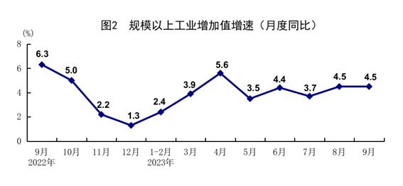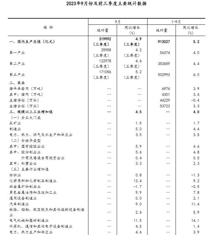 前三季度,全国规模以上工业增加值同比增长4.0%,比上半年加快0.2个百分点。分三大门类看,采矿业增加值同比增长1.7%,制造业增长4.4%,电力、热力、燃气及水生产和供应业增长3.5%。装备制造业增加值增长6.0%,比全部规模以上工业快2.0个百分点。分经济类型看,国有控股企业增加值同比增长4.6%;股份制企业增长4.8%,外商及港澳台商投资企业增长0.5%;私营企业增长2.3%。分产品看,太阳能电池、充电桩、新能源汽车产量分别增长63.2%、34.2%、26.7%。9月份,规模以上工业增加值同比增长4.5%,增速与上月持平,比7月份加快0.8个百分点;环比增长0.36%。1-8月份,全国规模以上工业企业实现利润总额同比下降11.7%,降幅比上半年收窄5.1个百分点,其中8月份同比增长17.2%。9月份,制造业采购经理指数为50.2%,比上月上升0.5个百分点,企业生产经营活动预期指数为55.5%。