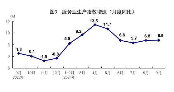 前三季度,服务业增加值同比增长6.0%。其中,住宿和餐饮业,信息传输、软件和信息技术服务业,租赁和商务服务业,交通运输、仓储和邮政业,金融业增加值分别增长14.4%、12.1%、9.5%、7.5%、7.0%。9月份,服务业生产指数同比增长6.9%,比上月加快0.1个百分点,增速连续2个月回升。其中,住宿和餐饮业,信息传输、软件和信息技术服务业,交通运输、仓储和邮政业生产指数分别增长17.7%、11.3%、9.3%。1-8月份,全国规模以上服务业企业营业收入同比增长7.2%。9月份,服务业商务活动指数为50.9%,比上月上升0.4个百分点;业务活动预期指数为58.1%。其中,水上运输、邮政、电信广播电视及卫星传输服务、互联网软件及信息技术服务、货币金融服务等行业商务活动指数位于55.0%以上较高景气区间。